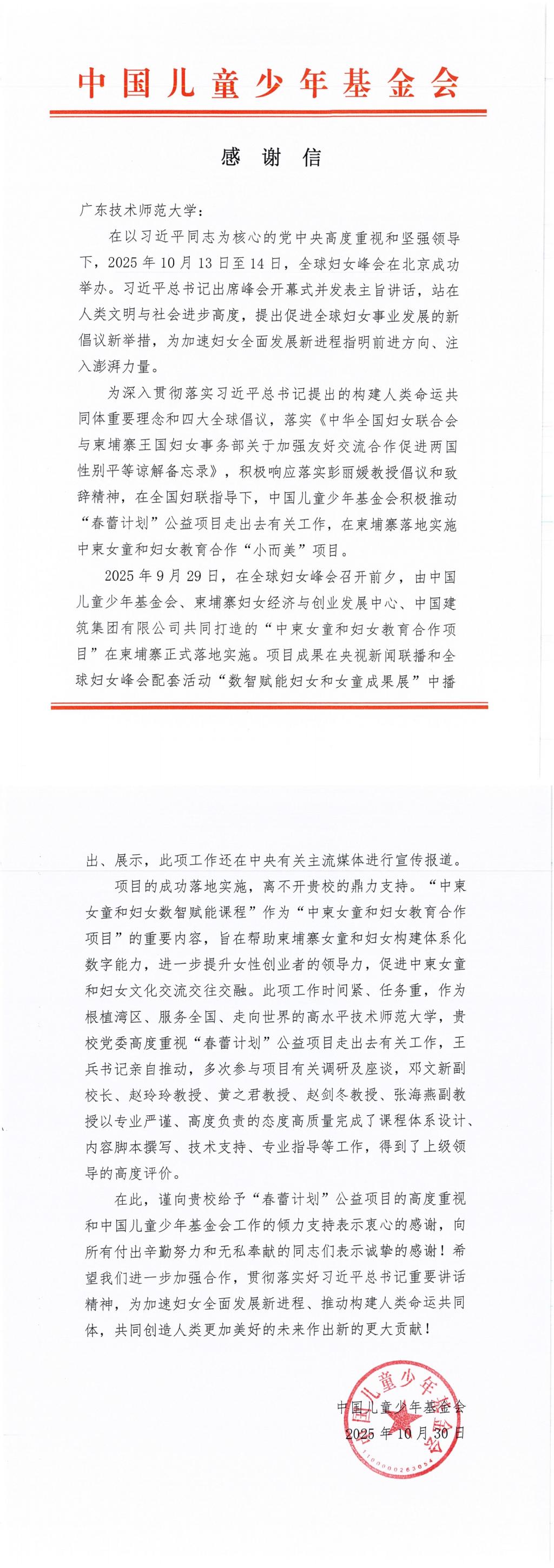 中國兒童少年基金會向我校發(fā)來感謝信 贊譽我校在中柬女童和婦女教育合作項目中貢獻突出